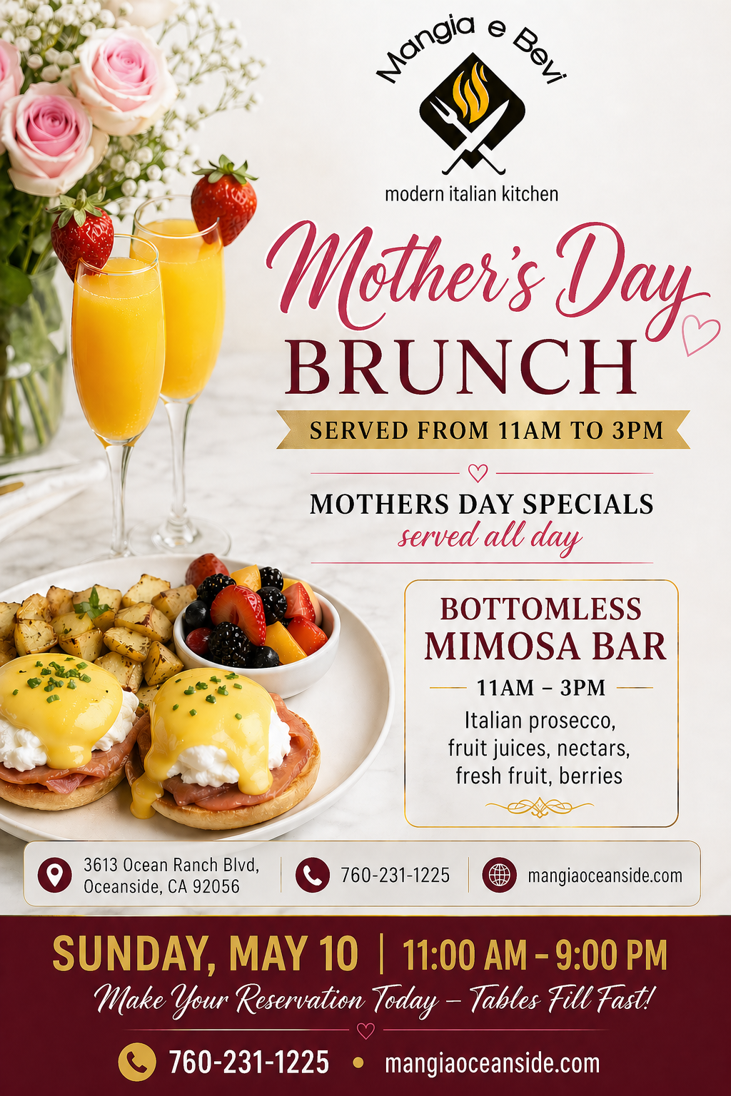 Mangia e Bevi is an authentic Italian restaurant in Oceanside, CA, serving handcrafted pizza, fresh pasta, and classic Italian dishes made with high-quality ingredients. Locally loved for our warm hospitality, Mangia e Bevi is a favorite spot for dine-in, takeout, and special occasions in Oceanside.