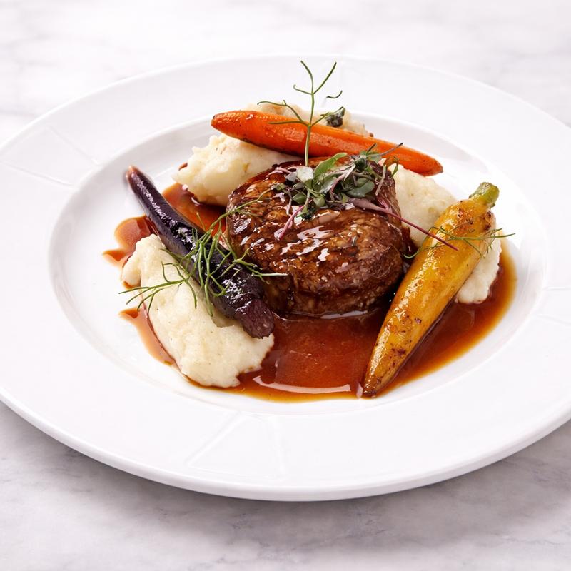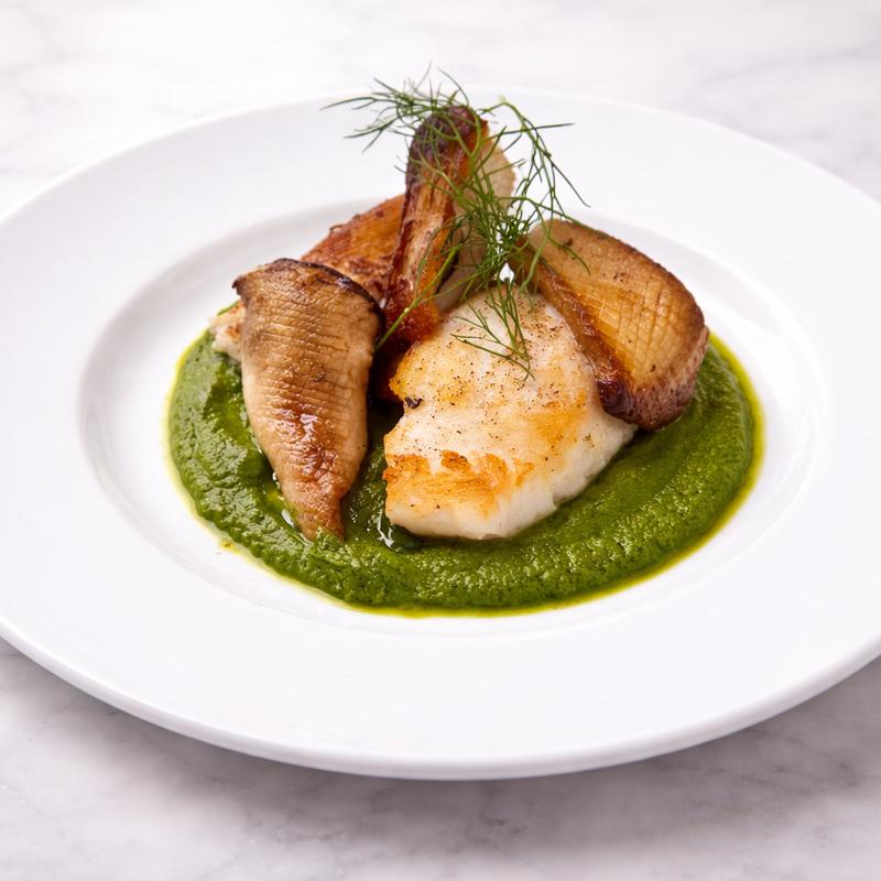 Pan-roasted with pomme pavé, arugula pesto, king oyster mushrooms