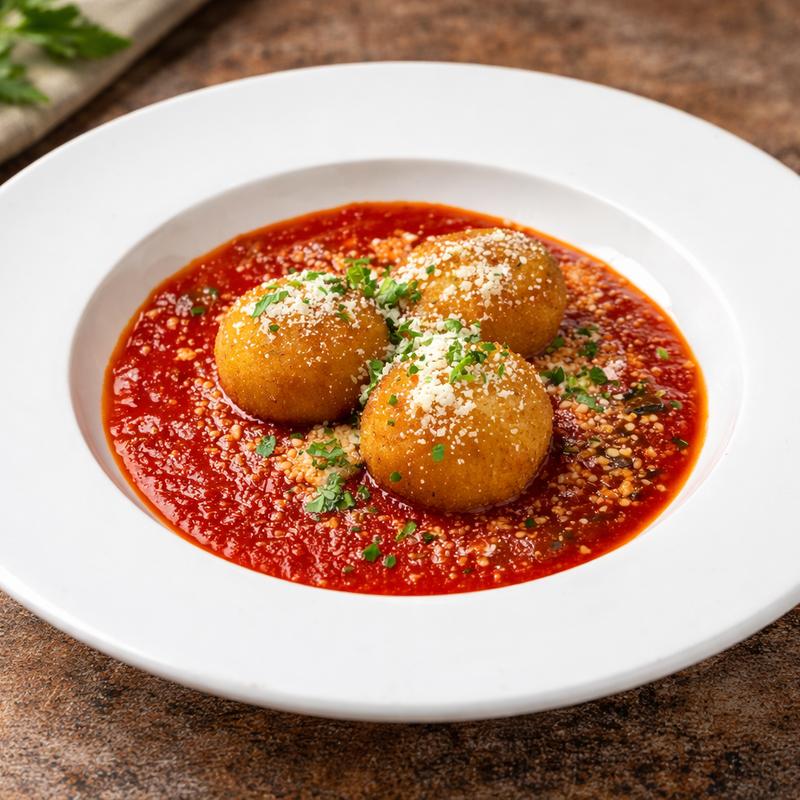 breaded rice balls, ground beef, peas, tomato sauce, pecorino