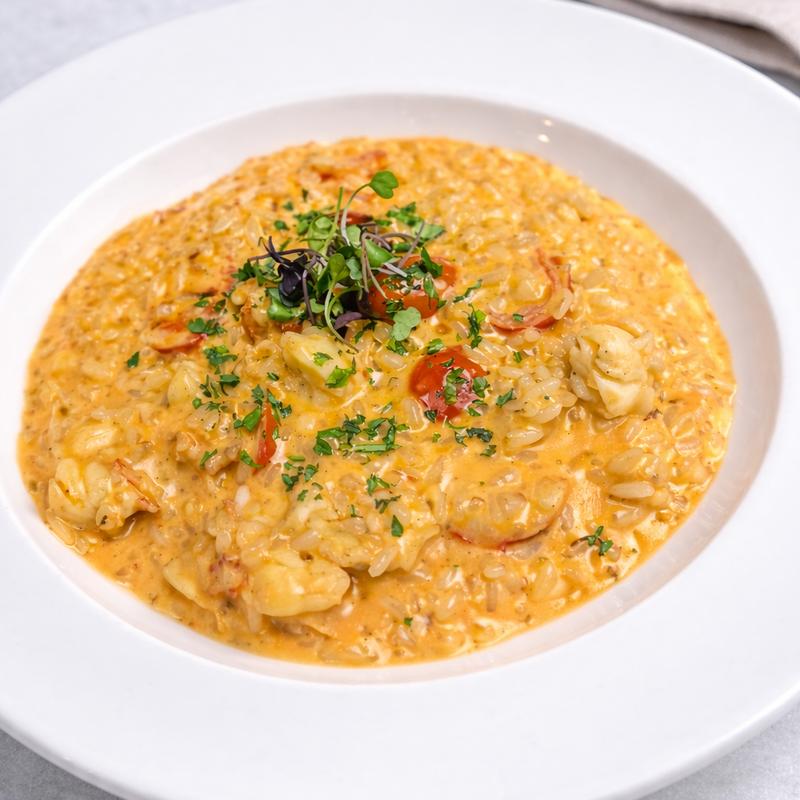 Cold water lobster tail, simmered in a rich bouillabaisse cream with shallots, garlic, and sweet cherry tomatoes