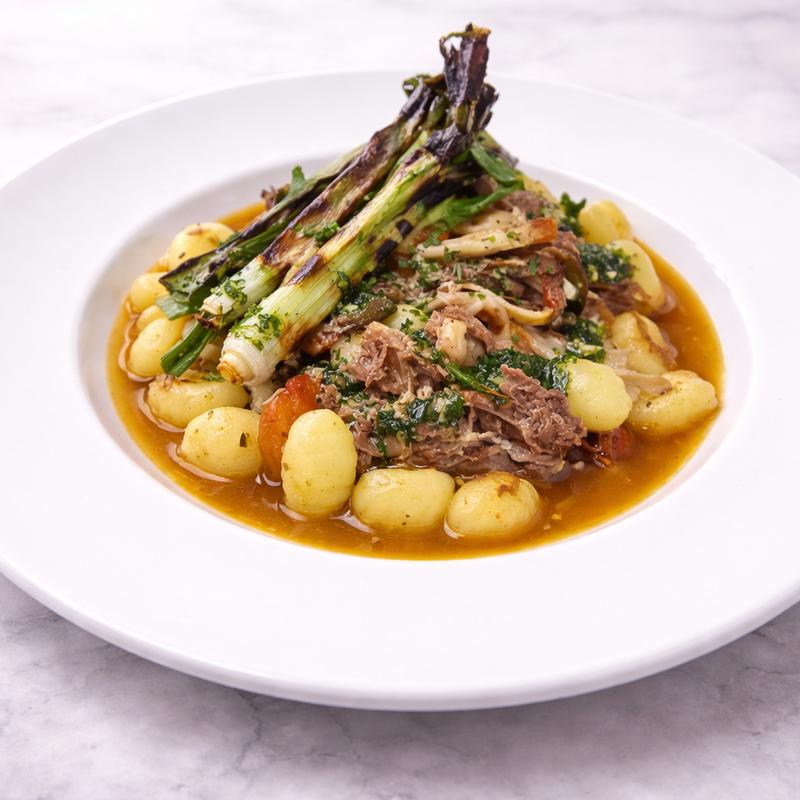 braised tenderloin, confit tomato, wild mushroom ragu, charred spring onion gremolata